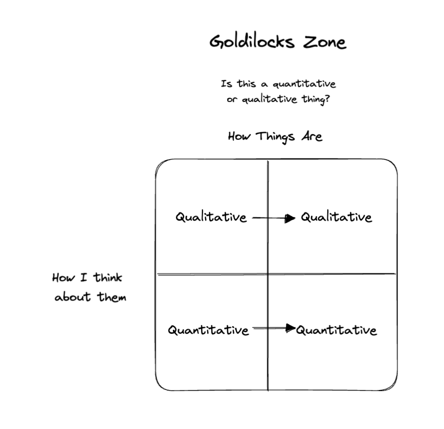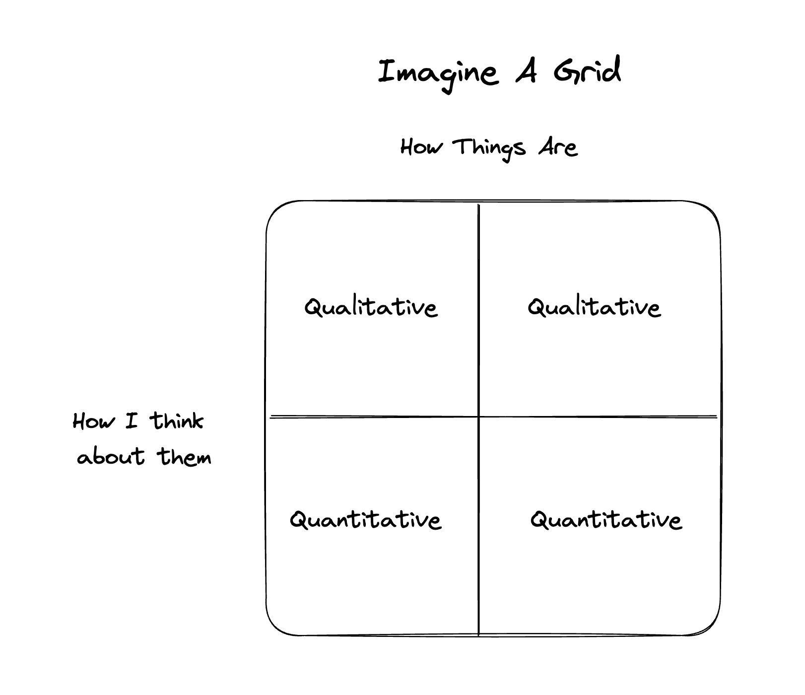 This is nowhere near an exact science. There are many things that fall on the line between qualitative and quantitative. The grid is meant to be a personal thinking guide/visual that your brain can easily store and recall, not a sign to tap or stick to hit others with.